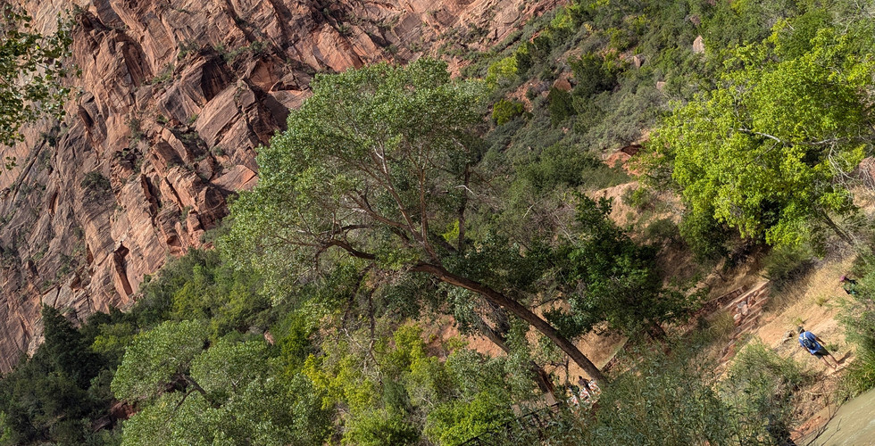 I highly recommend the Observation Point Trail. An alternative route to it is up by the resort where I stayed. You can drive to the trail head parking, I believe, but you can also go to the rec center at Ponderosa. From there you can book a shuttle for pretty cheap and have them both drop you off and pick you up at the road leading to the trail. Here's a blog from someone who also has done it, but he gives better directions to get there than I do. Families can probably do it if they have little ones, but parents might end up carrying them for parts of it. Watch them, though. At the end of hike when you're reaching the point, there are a few spots where I looked over the edge to find a straight drop down. But you have nothing to worry about if you keep them on the trail.